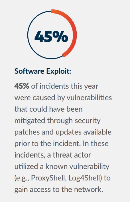 Ein prominenter Fall war die Ausnutzung der Log4Shell- und ProxyShell-Schwachstellen. Geschätzte 45 % der Cyberangriffe wurden durch bekannte Schwachstellen verursacht, für die bereits Sicherheitspatches und Updates verfügbar waren.