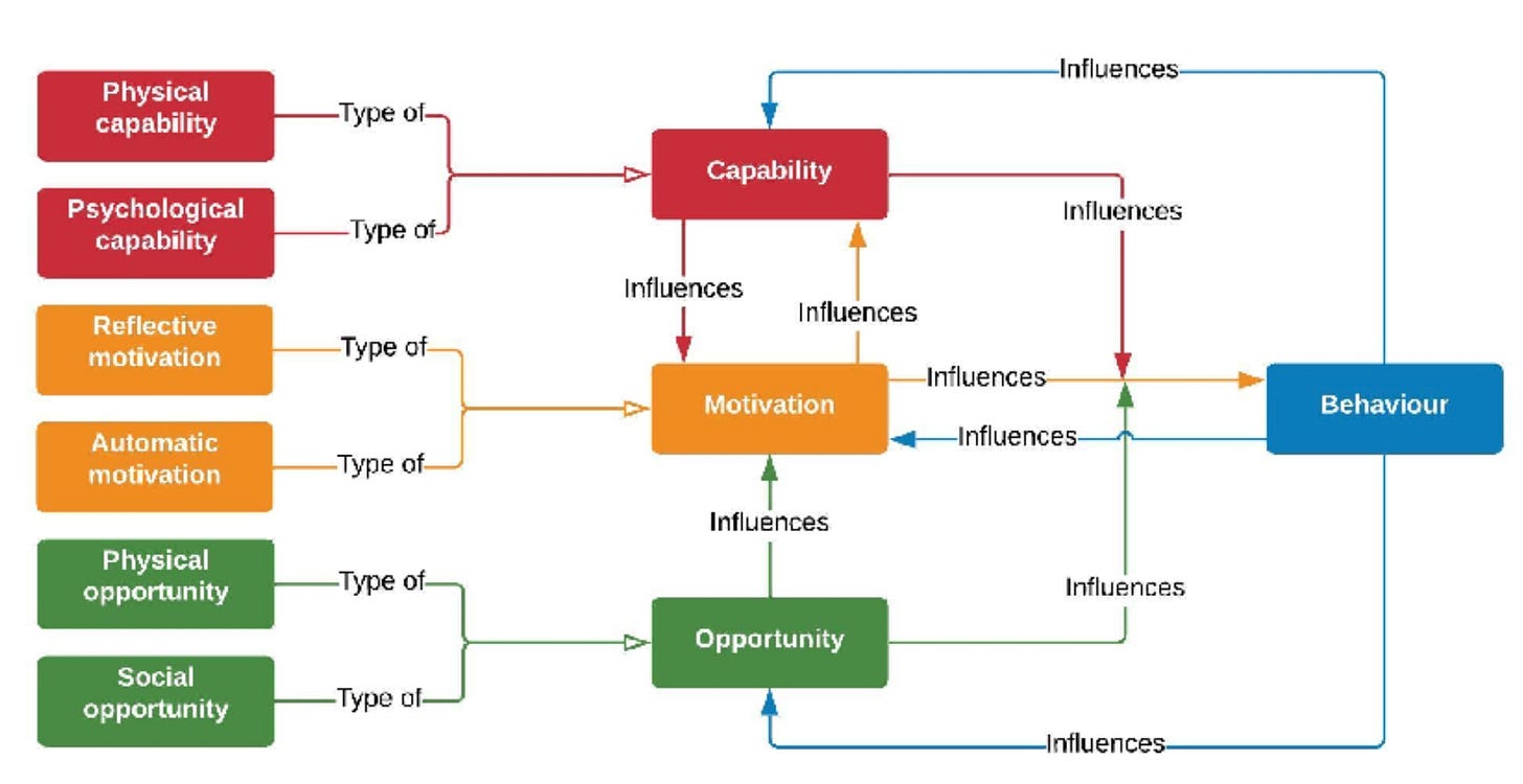 Das COM-B-Modell erklärt Verhaltensänderung. Es nennt drei nötige Teile für jedes Verhalten (B-ehaviour):