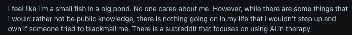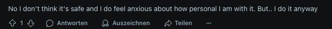 In einem Reddit Forum “Do people think it’s safe to say personal stuff to ChatGPT” sehe ich 147 Kommentare und sah keinen einzigen, der einen triftigen Grund sieht, GPT nicht seine ganzen Sorgen anzuvertrauen.