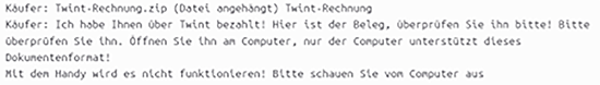 Eine weitverbreitete Form des Online-Betrugs sind Scams. Wer schon einmal etwas auf Ricardo oder Tutti verkauft hat, hat sicher schon von „Kleinanzeigenbetrug“ gehört. Seit Oktober haben die Betrüger ihre Masche noch weiter ausgefeilt. Bisher ging es nur um unsere Zahldaten, nun möchten sie mehr und verbreiten mit dieser Masche zusätzlich eine Schadsoftware, einen sogenannten „Info-Stealer“. Ein Kollege aus dem Incident-Response-Bereich bestätigt mir dieses Bild. Diese Malware liest alle sensiblen Daten aus, die sie auf unserem System findet, und nutzt sie gegen uns. Sie kann im Browser gespeicherte Login-Daten und Zahlungsdaten auslesen, Screenshots machen, um uns zu beobachten, oder Informationen über unsere Dateien und Inhalte heimlich an die Betrüger übertragen.