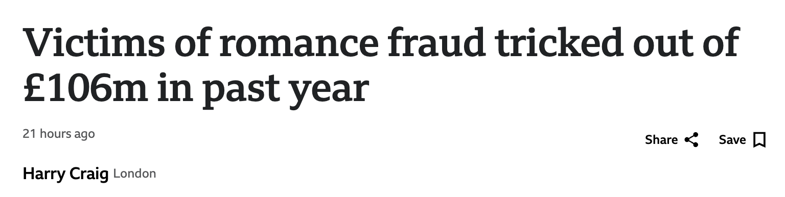 Victims of romance fraud tricked out of £106m last year. (2025, Oktober 17). https://www.bbc.com/news/articles/c24l5301gg8o